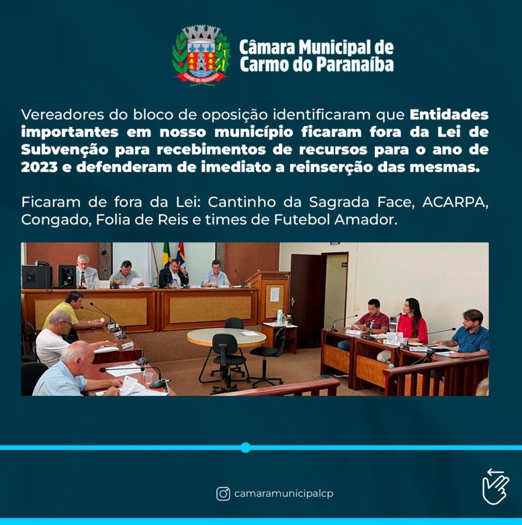Vereadores do bloco de oposição identificaram que Entidades importantes no município ficaram fora da Lei de Subvenção para recebimentos de recursos para o ano de 2023 e defenderam de imediato a reinserção das mesmas.