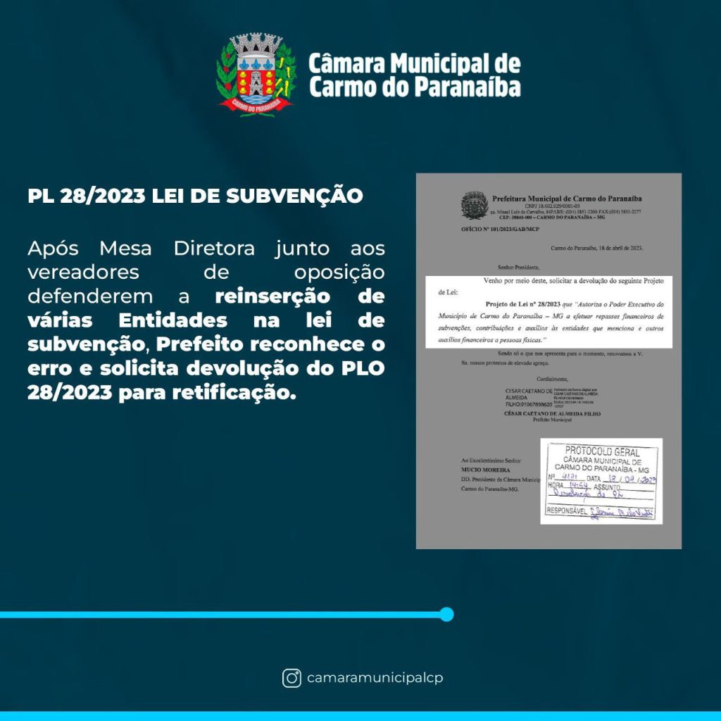 Após Mesa Diretora, junto aos vereadores de oposição defenderem a reinserção de várias Entidades na lei de subvenção, o Prefeito reconheceu o erro e solicitou a devolução do PLO 28/2023 para retificação.