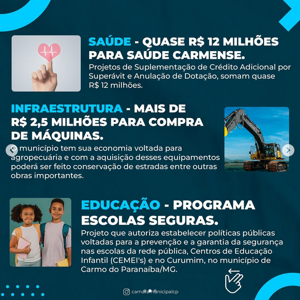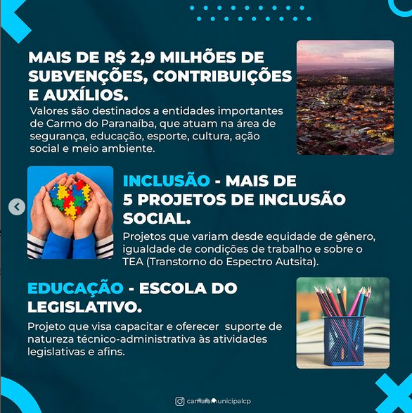 Foram R$2,9 milhões destinados a entidades importantes de Carmo do Paranaíba que atuam na área de segurança, educação, esporte, cultura, ação social e meio ambiente.