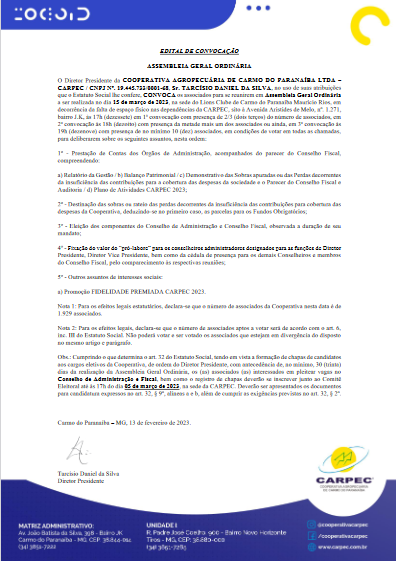 A COOPERATIVA AGROPECUÁRIA DE CARMO DO PARANAÍBA LTDA (CARPEC) convoca todos os associados para Assembleia Geral Ordinária a ser realizada no dia 15 de março de 2023, na sede do Lions Clube de Carmo do Paranaíba Maurício Rios às 17h (dezessete) em 1ª convocação com presença de 2/3 (dois terços) do número de associados, em 2ª convocação às 18h (dezoito) com presença da metade mais um dos associados ou ainda, em 3ª convocação às 19h (dezenove) com presença de no mínimo 10 (dez) associados, em condições de votar em todas as chamadas, para deliberarem sobre os seguintes assuntos, nesta ordem: