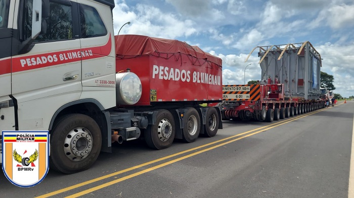 Uma carreta longa, que transporta um transformador de energia, foi parada pela Polícia Militar Rodoviária (PMR) no km 233 da BR-352/354 em Carmo do Paranaíba. Apesar de estar acompanhado de batedores, o veículo não tinha autorização para trafegar pela referida rodovia.