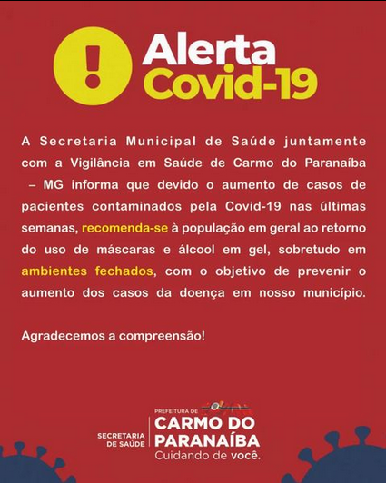 A Secretaria Municipal de Saúde (SMS) juntamente com a Vigilância em Saúde de Carmo do Paranaíba voltou a recomendar o uso de máscaras, principalmente em locais fechados com o objetivo de prevenir o aumento de casos de Covid-19 no município.