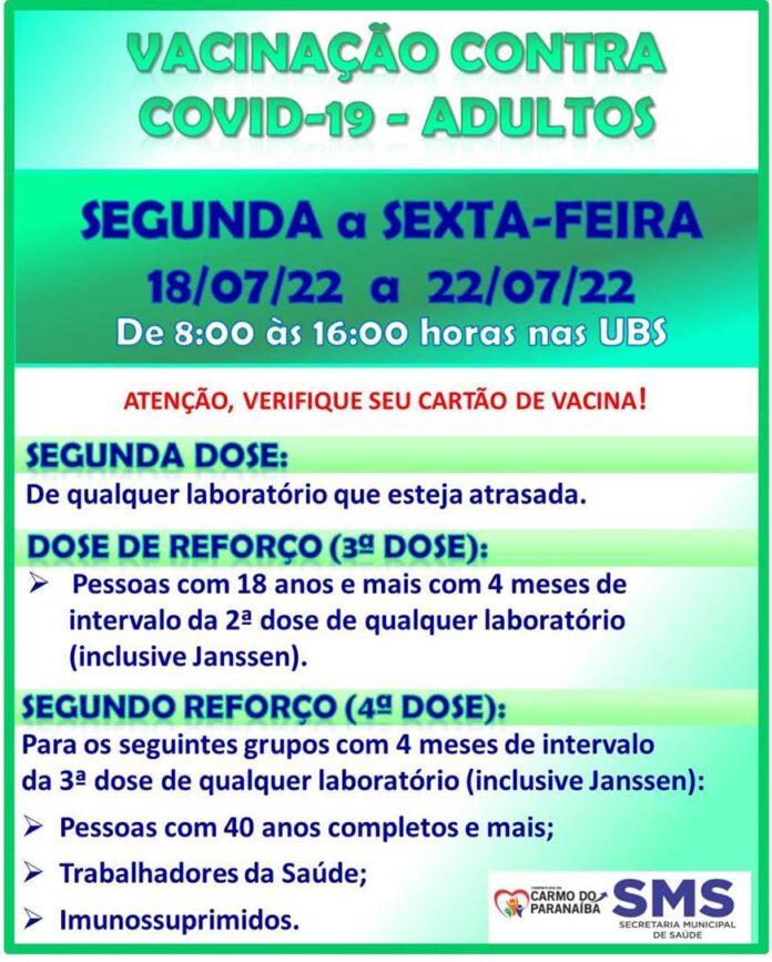 A Secretaria de Saúde de Carmo do Paranaíba divulgou o cronograma para a vacinação contra a COVID-19, que vai desta segunda (18) até a próxima sexta (29/7). As doses serão aplicadas em todas as Unidades Básicas de Saúde (UBS), no horário de 08h00 as 16h00.