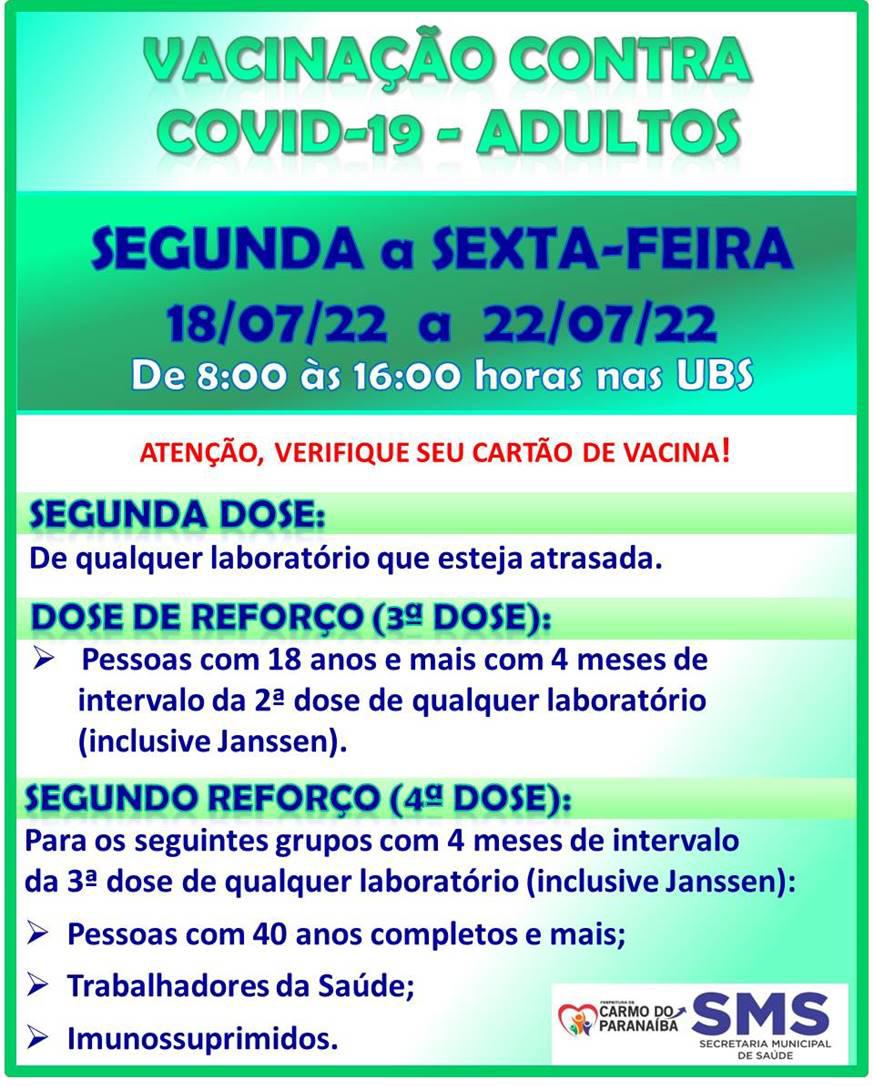 A vacinação é para 2ª dose de qualquer laboratório, para as pessoas que estejam com os cartões atrasados, reforço para 3ª e 4ª doses, sendo que para a última vale para as pessoas com 40 anos completos, trabalhadores da saúde e imunossuprimidos.