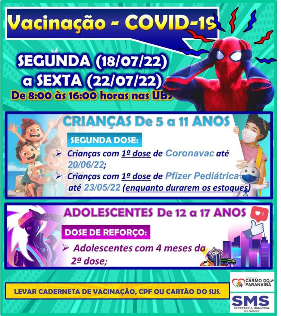 A Secretária informa ainda que estarão sendo vacinadas com a 2ª dose, as crianças de 5 a 11 que foram vacinadas com a CORONAVAC até o dia 20 de junho e para aquelas vacinadas com a Pfizer até o dia 23 de maio. Já para adolescentes de 12 a 17 anos está liberado a dose de reforço, desde que tenham mais de 4 meses de vacinação da 2ª dose.