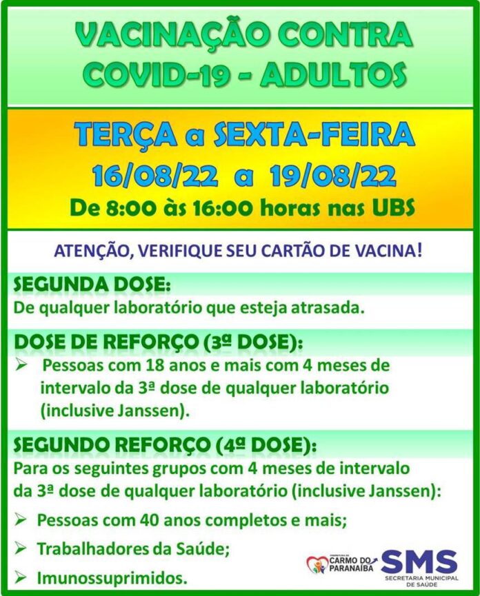 - Pessoas com 18 anos e mais com 4 meses de intervalo da 2ª dose de qualquer laboratório (incluindo vacinados com JANSSEN)