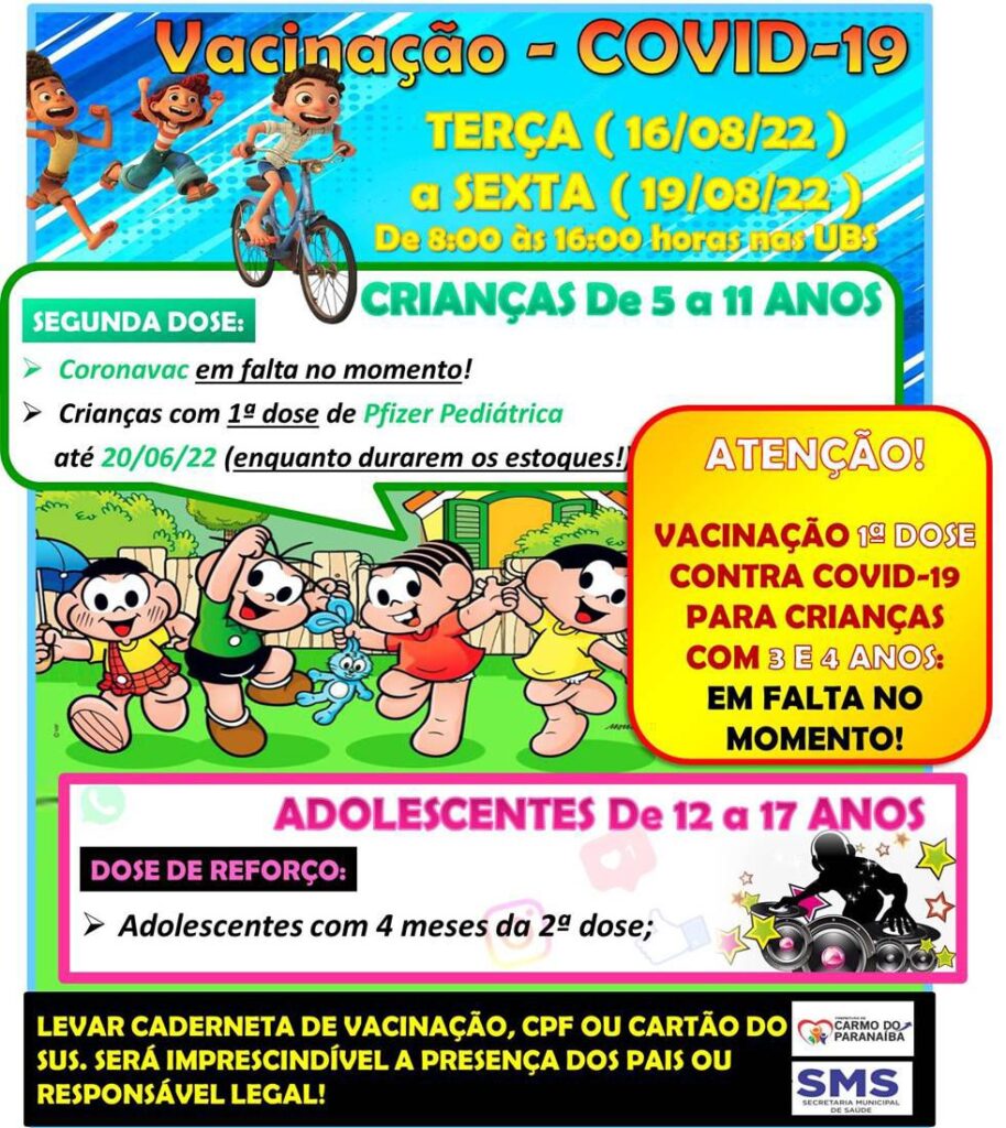 - Vacinação de 2ª dose das crianças vacinadas com a 1ª dose de CORONAVAC: EM FALTA NO MOMENTO!!