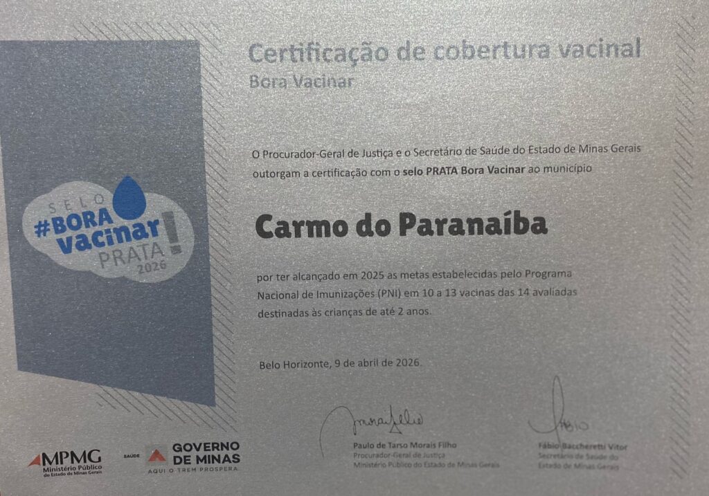 O município de Carmo do Paranaíba alcançou um importante reconhecimento na área da saúde ao conquistar o Selo Prata no programa Bora Vacinar, durante o evento Conexão Minas Saúde 2026, realizado em Belo Horizonte.