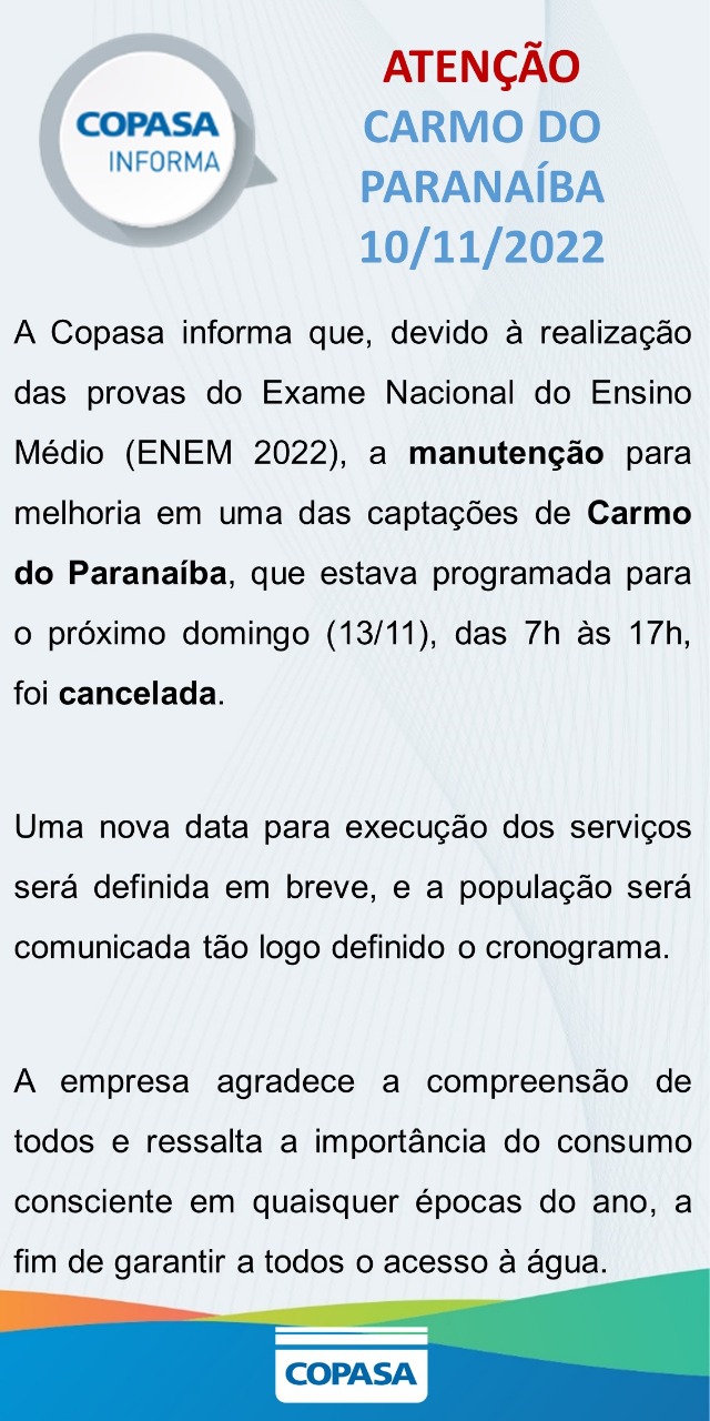 Após comunicar que interromperia o fornecimento de água para melhoria em uma das captações no próximo domingo (13/11) em Carmo do Paranaíba, a COPASA voltou atrás e informou que, devido à realização das provas do Exame Nacional do Ensino Médio (ENEM) marcado para a mesma data, o procedimento foi cancelado.