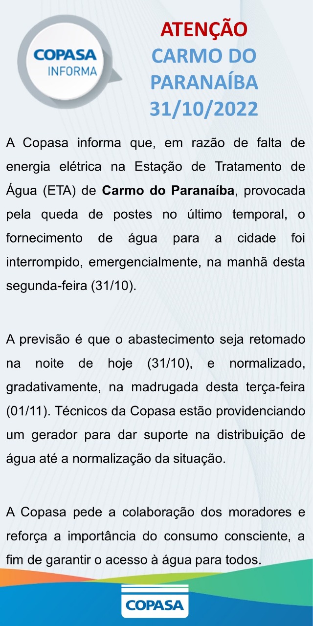 A COPASA comunica que o fornecimento de água em Carmo do Paranaíba foi interrompido na manhã desta segunda-feira (31), devido à falta de energia elétrica na estação de tratamento (ETA).