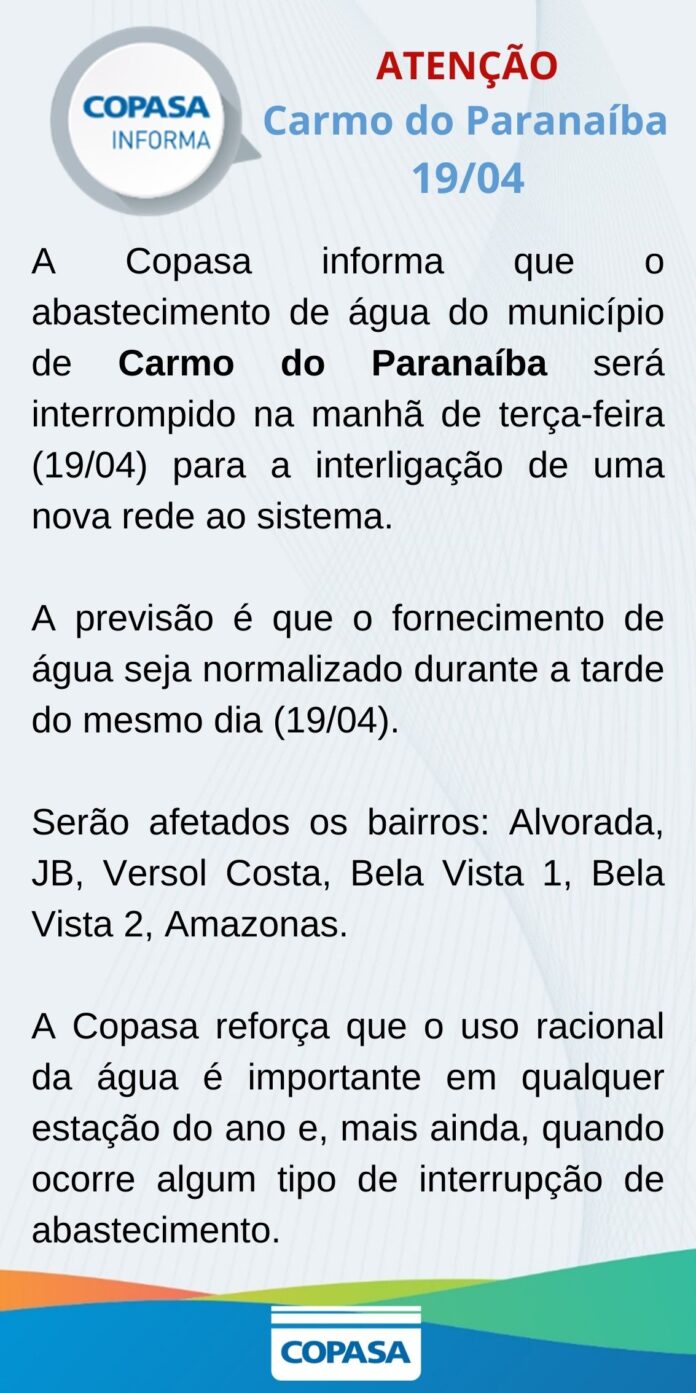 A Copasa informa que o abastecimento de água do município de Carmo do Paranaíba será interrompido na manhã de terça-feira (19/04) para a interligação de uma nova rede ao sistema.