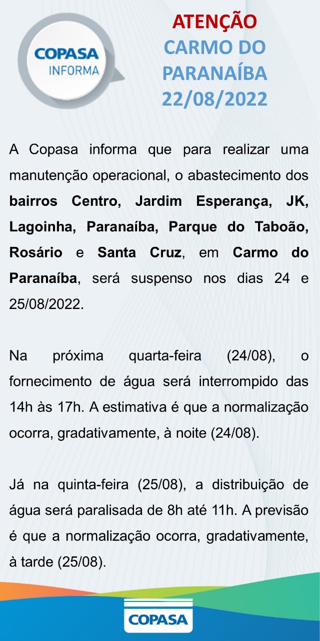 A COPASA comunica que irá interromper o fornecimento de água em Carmo do Paranaíba nos dias 24 e 25 de agosto. Os bairros atingidos são: Centro, Jardim Esperança, JK, Lagoinha, Paranaíba, Parque do Taboão, Rosário e Santa Cruz.