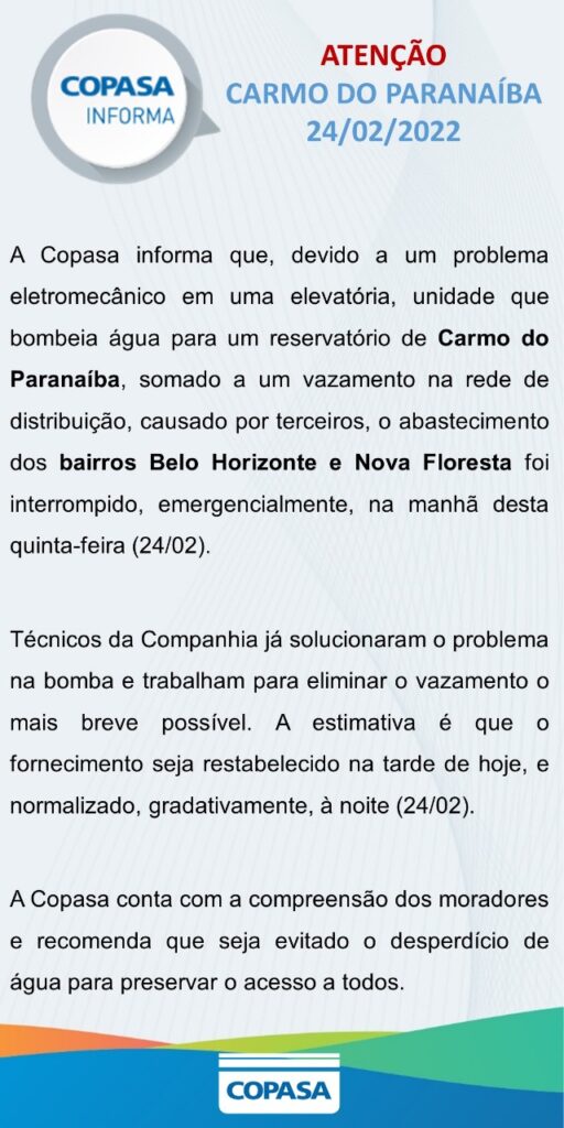 A Copasa informa que a previsão é que o abastecimento para os bairros Belo Horizonte e Nova Floresta, em Carmo do Paranaíba, seja restabelecido na tarde desta quinta-feira, e normalizado, gradativamente, à noite (24/02).