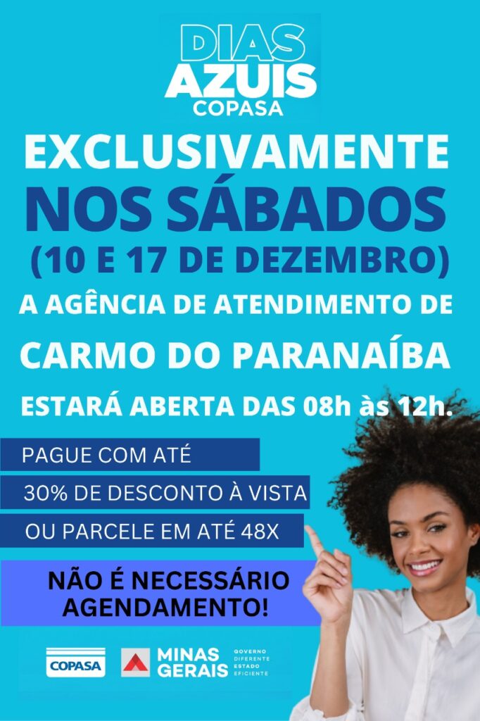 Em continuidade à campanha Dias Azuis, que visa à renegociação de débitos referentes às contas de água e esgoto em todo o Estado, algumas agências de atendimento da Companhia de Saneamento de Minas Gerais (Copasa) na região estarão de portas abertas também aos sábados, nos dias 10 e 17 de dezembro, das 8h às 12h, para atender exclusivamente àqueles que desejam participar dessa conciliação.