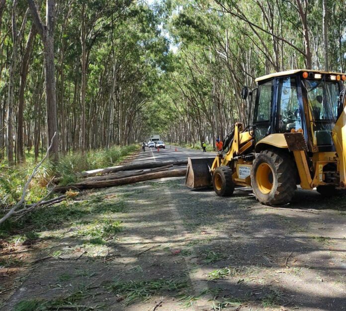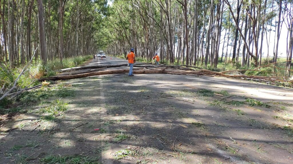 A prefeitura de Carmo do Paranaíba está prestando apoio ao serviço disponibilizando um trator para a retirada das árvores cortadas.
