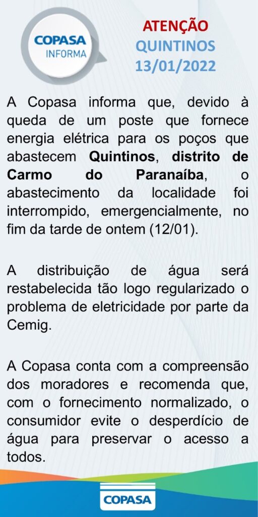 A Companhia de Saneamento e Abastecimento de Minas Gerais (COPASA), informou em nota que o abastecimento de água no Distrito de Quintinos foi interrompido no início da noite de ontem (12).