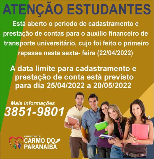 A prefeitura de Carmo do Paranaíba informa aos alunos do transporte universitário, que já estão cadastrados e receberam a primeira parcela do benefício, devem levar nota fiscal do transporte para receber a segunda parcela.