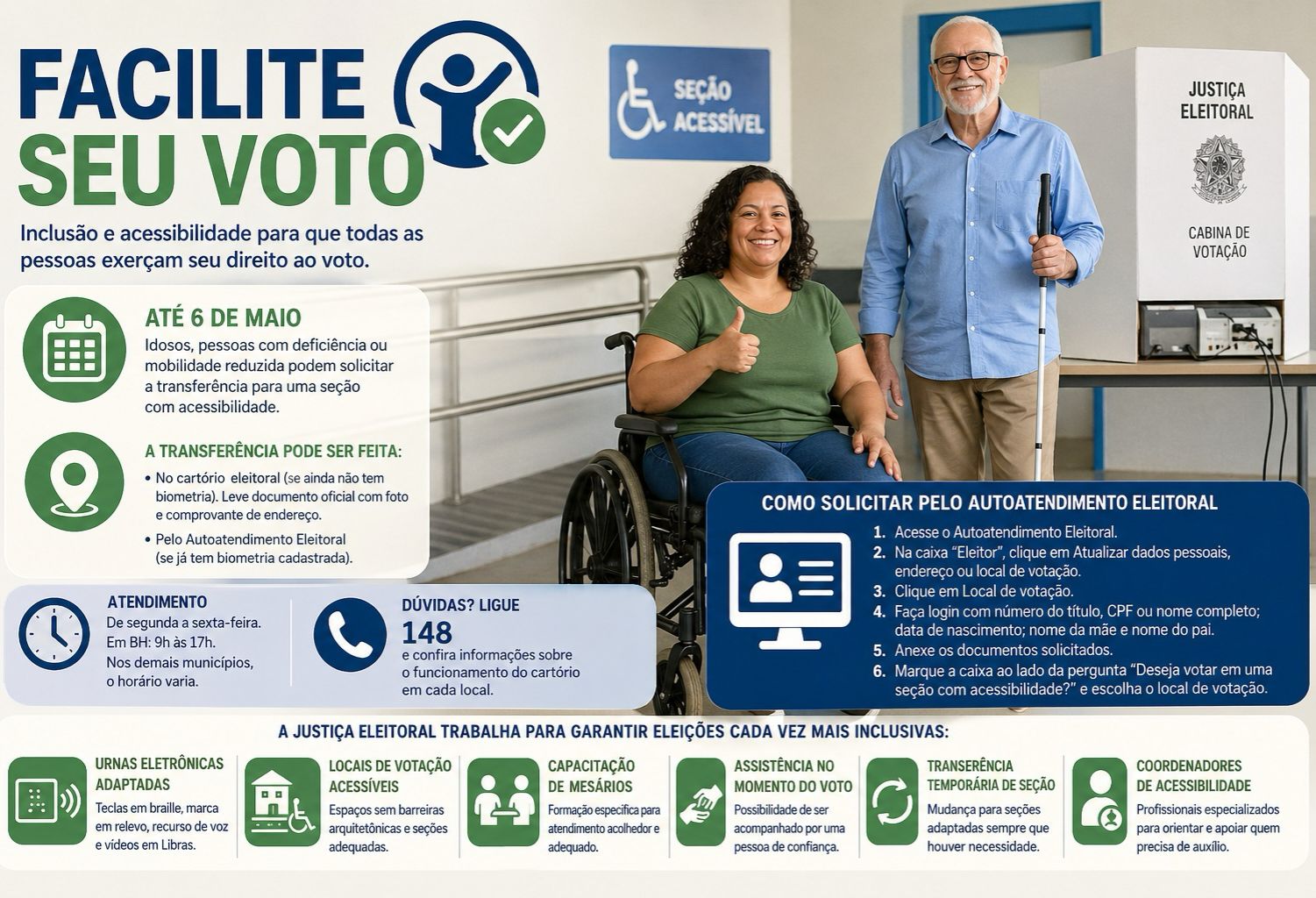 Idosos e pessoas com deficiência ou mobilidade reduzida têm até 6 de maio, dia do fechamento do cadastro, para solicitar a sua transferência para uma seção com acessibilidade e ter mais tranquilidade para exercer o direito ao voto. O alerta faz parte da campanha Facilite seu Voto, que procura promover a inclusão dessas pessoas no processo eleitoral.