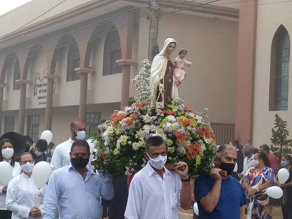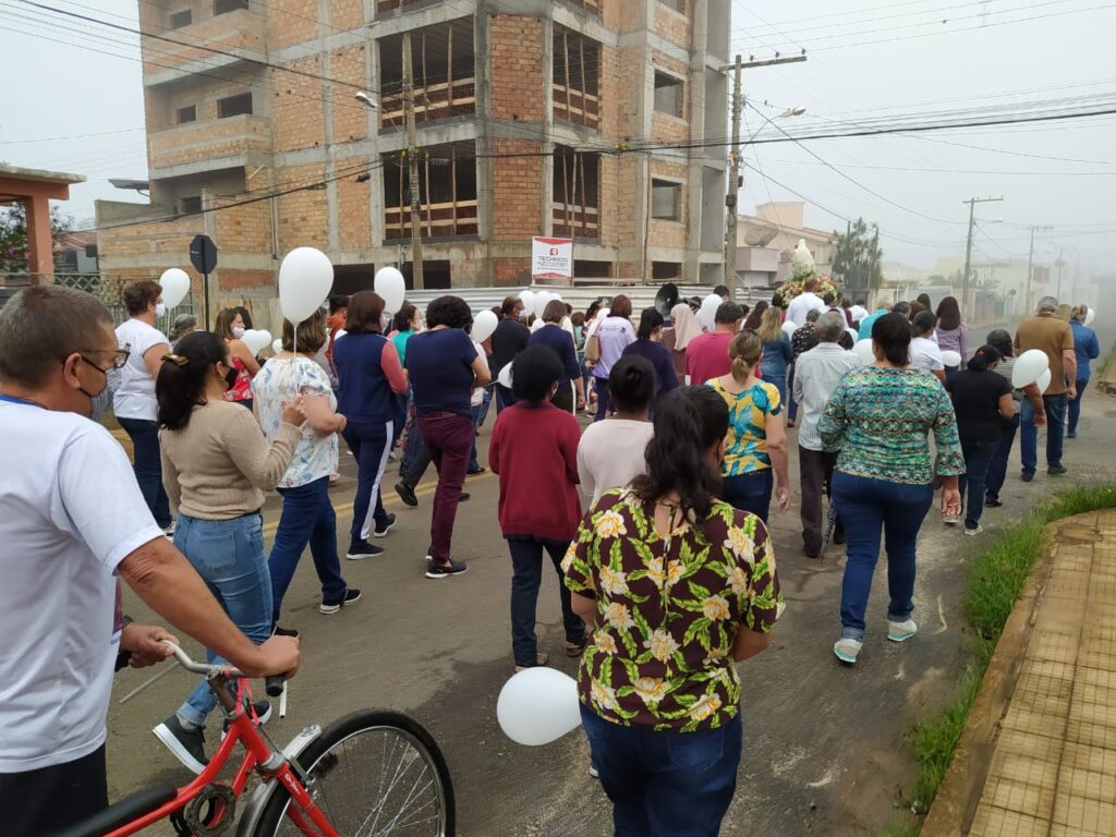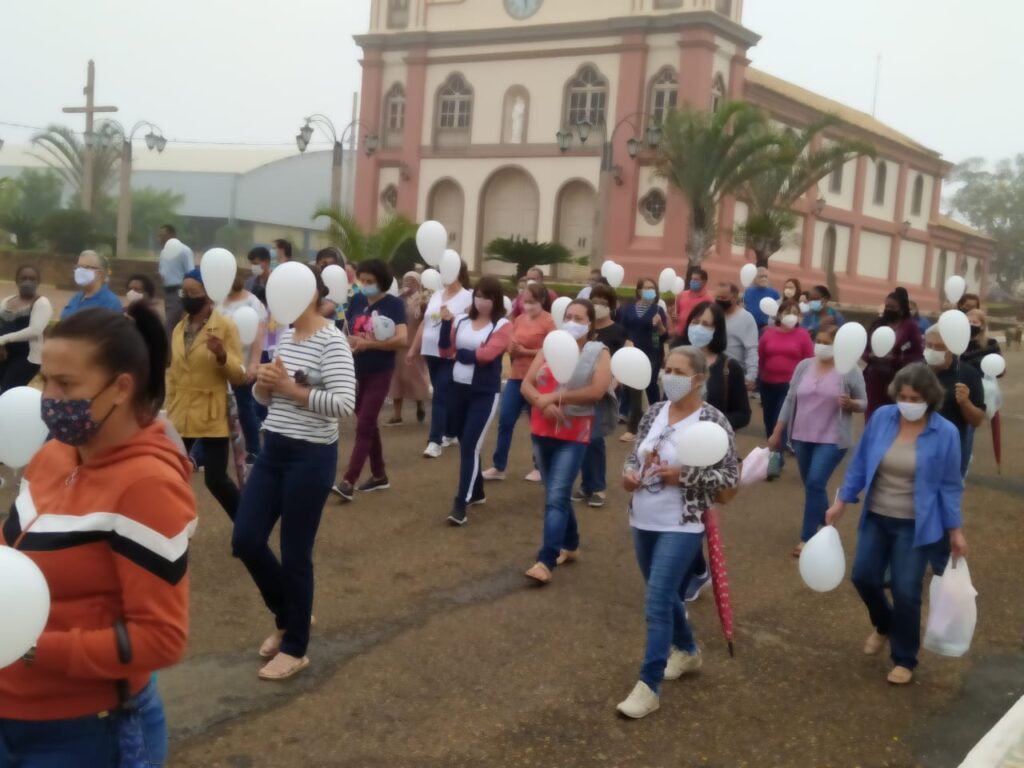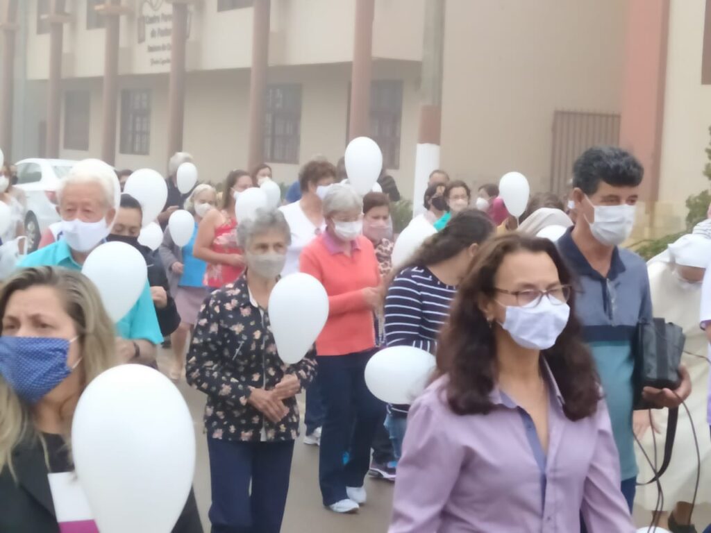 Sob neblina cinzenta e segurando balões brancos, fieis realizaram o percurso com orações e um sentimento de saudade.