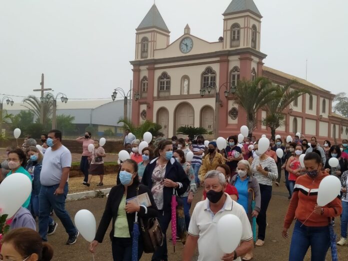 Sob neblina cinzenta e segurando balões brancos, fieis realizaram o percurso com orações e um sentimento de saudade.