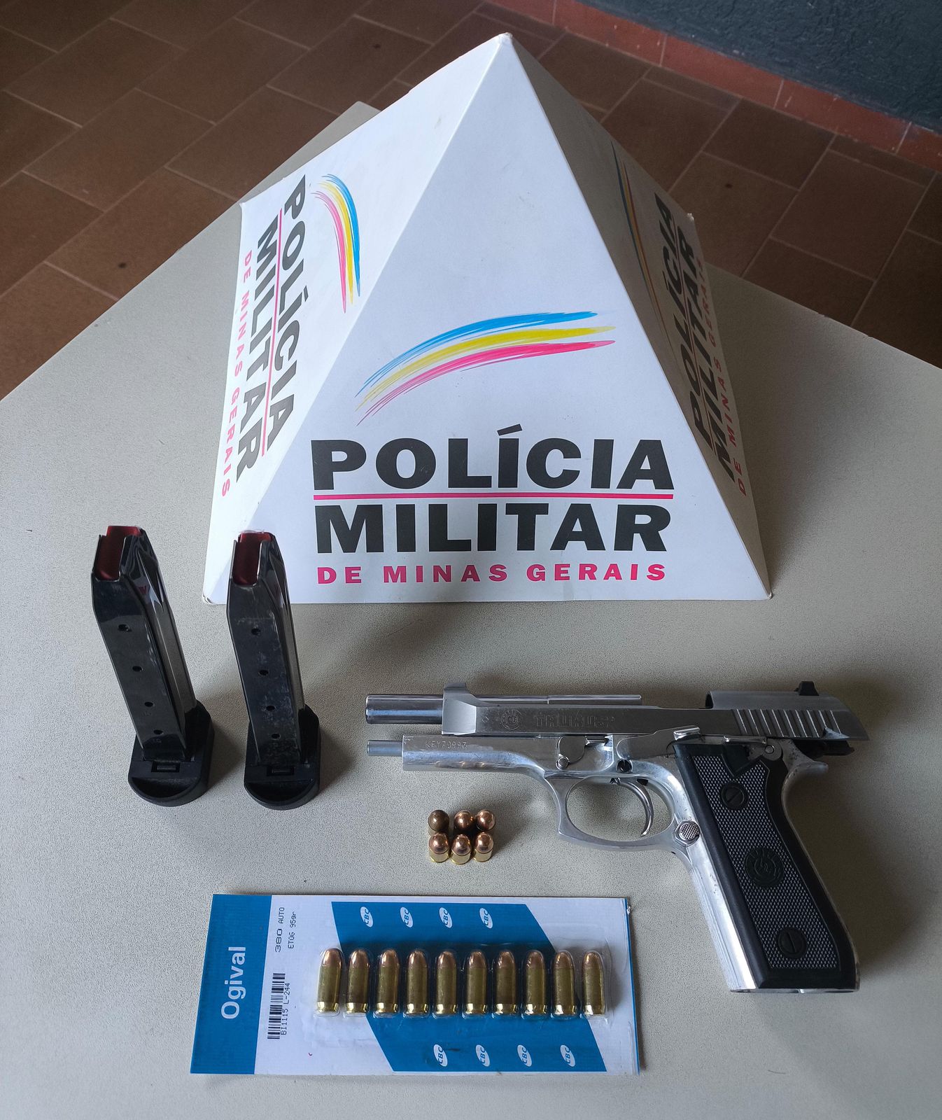 Com ele, foram apreendidos uma pistola Taurus calibre .380, dois carregadores e dezesseis munições do mesmo calibre.