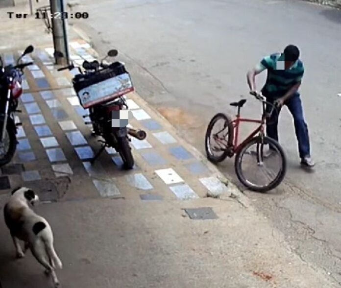 As câmeras do estabelecimento flagraram o momento em que um cliente chega à mercearia e deixa sua bicicleta encostada no meio fio. Em seguida um homem desce a pé pela avenida e quando chega no local, simplesmente pega a bicicleta e sai tranquilamente.