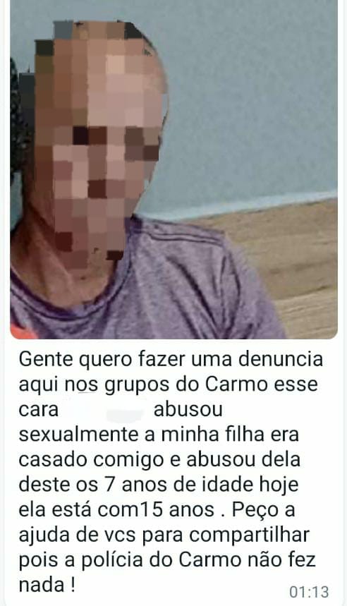 No texto a mulher diz: “GENTE QUERO FAZER UMA DENUNCIA AQUI NOS GRUPOS DO CARMO ESSE CARA [nome do homem] ABUSOU SEXUALMENTE MINHA FILHA ERA CASADO COMIGO E ABUSOU DELA DESDE OS 7 ANOS DE IDADE HOJE ELA ESTÁ COM 15 ANOS. PEÇO A AJUDA DE VCS PARA COMPARTILHAR POIS A POLÍCIA DO CARMO NÃO FEZ NADA!”