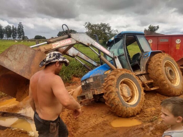 Em outro ponto, nem mesmo um trator escapou de ficar preso sobre o barro. Nesse momento, alguns homens tentam tirar o veículo do atoleiro.