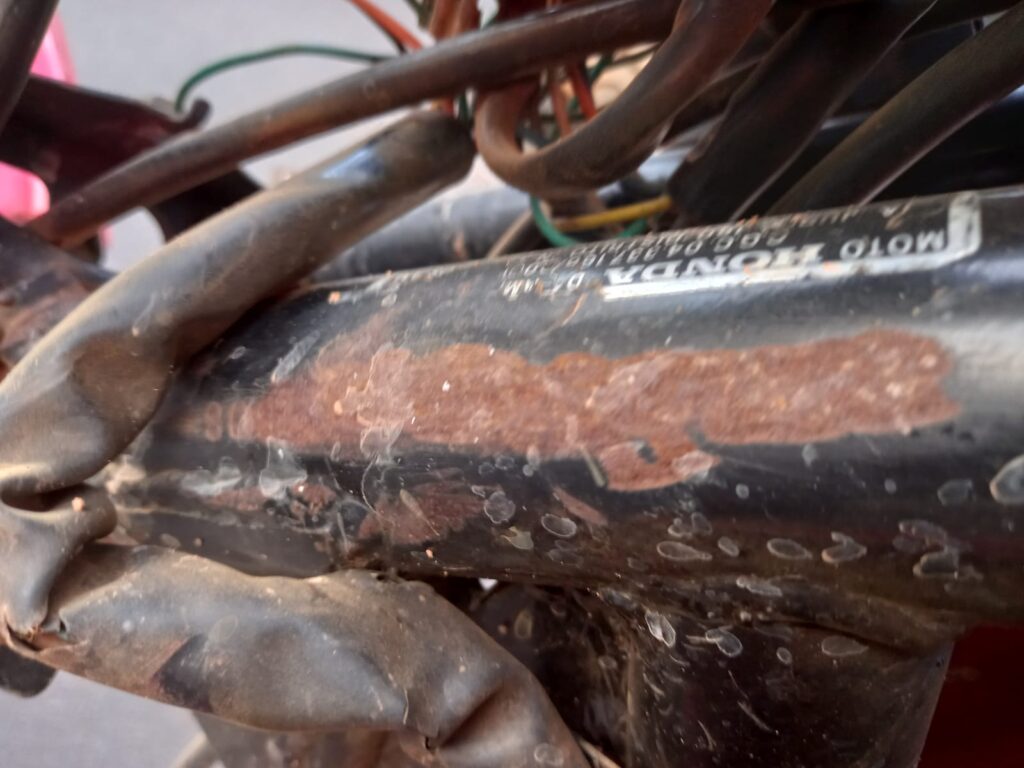 Em fiscalização à motocicleta, ela não possui placa de identificação veicular, ao localizar o chassi da motocicleta, encontrava-se raspado/ suprimido, tornando o veículo adulterado.
