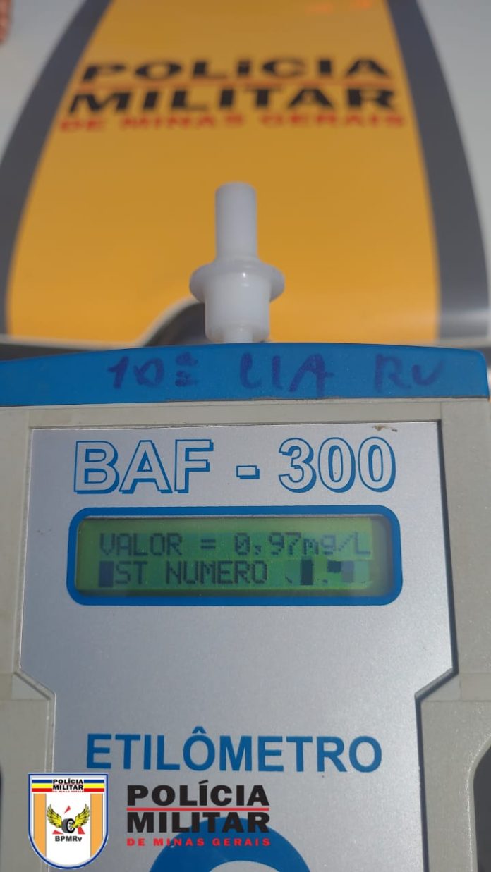 Convidado, o abordado realizou o teste de alcoolemia no aparelho etilometro e este aferiu o valor de 0,97 mg/l (miligramas de álcool por litro de ar alveolar expirado).