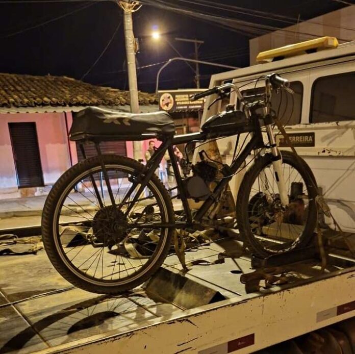 A Polícia Militar de Carmo do Paranaíba, apreendeu nesta terça-feira (28/10) uma bicicleta motorizada em desacordo com a lei. O fato ocorreu durante patrulhamento, quando uma guarnição policial visualizou em via pública uma pessoa conduzindo um veículo motorizado construída artesanalmente, em desconformidade com a lei e causando perturbação do sossego.