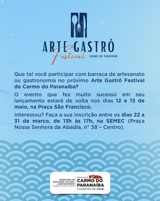 A prefeitura de Carmo do Paranaíba abriu inscrições para profissionais que tenham interesse em participar do próximo Arte Gastrô Festival que será realizado nos dias 12 e 13 de maio, na praça São Francisco, em Carmo do Paranaíba.