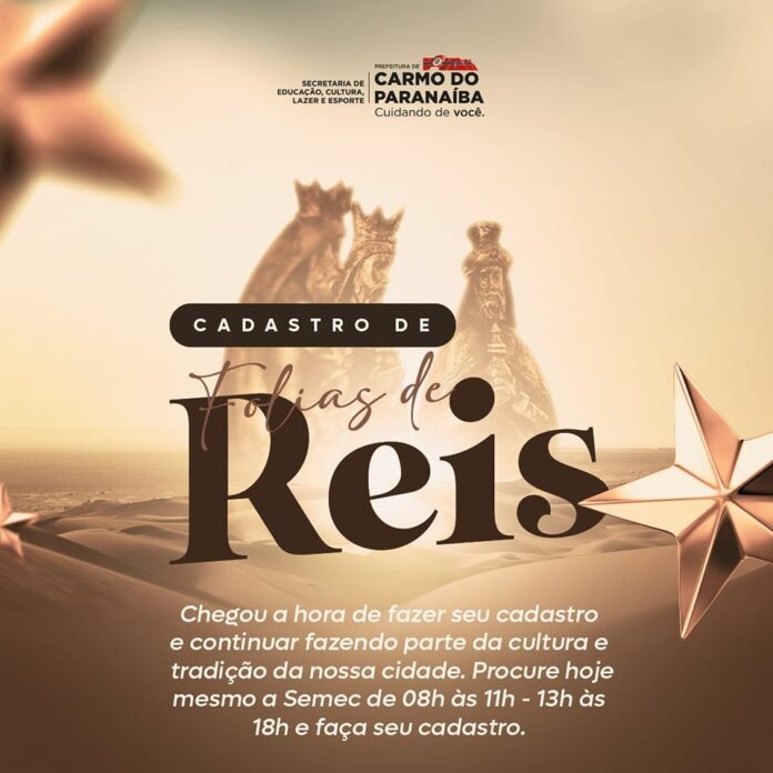 A prefeitura de Carmo do Paranaíba, através da Secretaria Municipal de Educação, Cultura, Lazer e Esporte – Divisão de Cultura e Turismo, quer realizar o cadastro das pessoas que fazem parte de grupos de Folia de Reis no município.