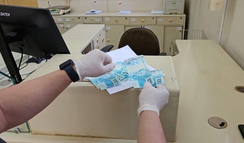 O suspeito foi detido logo após receber a encomenda na agência dos Correios. O envelope foi aberto e foram encontradas 30 notas com indícios de falsidade, todas de cem reais.