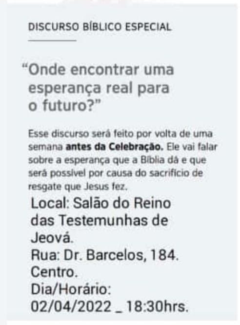 Para compartilhar com outros essa expectativa de dias melhores, as Testemunhas de Jeová apresentarão na semana de 2 de abril uma palestra bíblica intitulada Onde encontrar uma esperança real para o futuro? O encontro será realizado em 239 países e territórios. No Brasil, ele ocorrerá de forma presencial e virtual. Serão abordadas algumas questões: