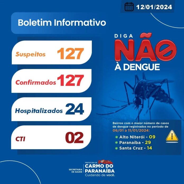 O Boletim Informativo divulgado pela Secretaria de Saúde de Carmo do Paranaíba no último dia 12 de janeiro traz a confirmação de 127 casos de dengue no município.