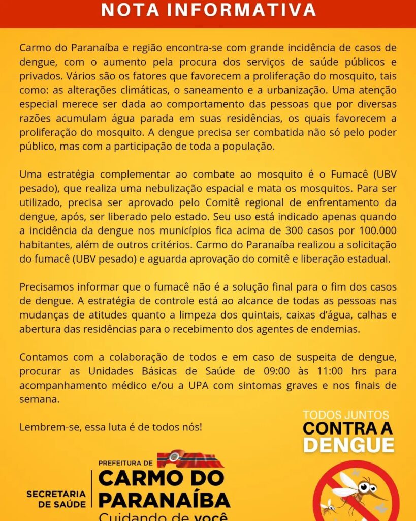 A prefeitura de Carmo do Paranaíba lançou nos últimos dias uma nota alertando a população dos perigos da doença e a possibilidade da aplicação do fumacê.