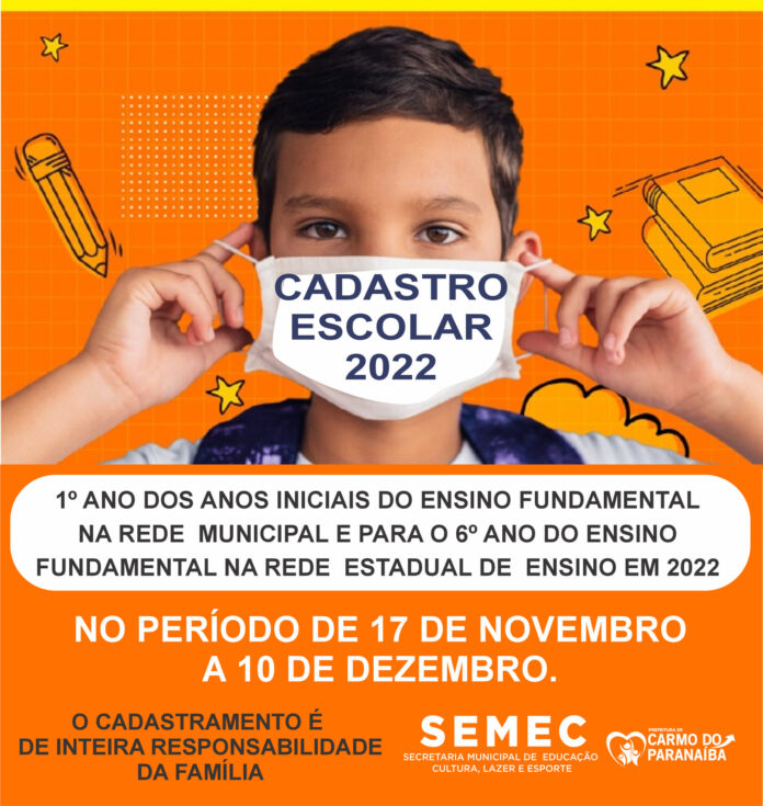 O cadastro é a única forma de garantir a vaga do seu filho(a) para o 1º Ano dos Anos Iniciais do Ensino Fundamental na Rede Municipal e para o 6º ano do Ensino Fundamental na Rede Estadual de Ensino em 2022, sendo realizado via internet, pelo site www.cadastroescolar.educacao.mg.gov.br no período de 17/11/21 a 10/12/21, conforme normas estabelecidas pela Resolução SEE Nº 4.643, publicada no MG de 22/10/2021.