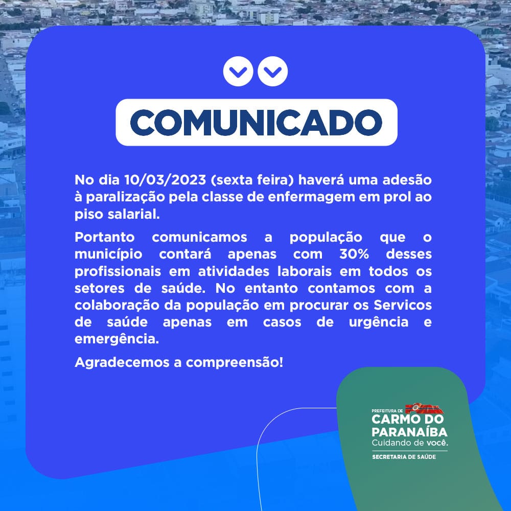 A Secretaria Municipal de Saúde (SMS) de Carmo do Paranaíba informa que amanhã (10) haverá uma adesão à paralisação pela classe de enfermagem em prol ao piso salarial.