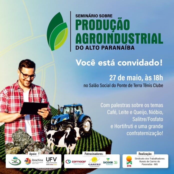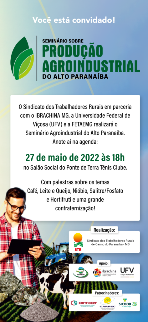 O Sindicato dos Trabalhadores Rurais de Carmo do Paranaíba em parceria com o IBRACHINA/MG, a Universidade Federal de Viçosa (UFV) e a FETAEMG vai realizar um Seminário sobre Produção Agroindustrial no próximo dia 27/5.