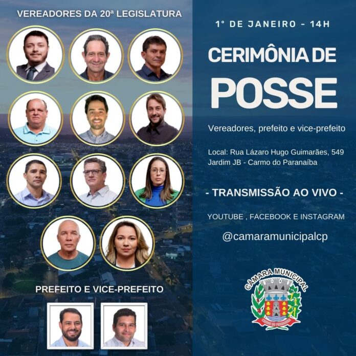 Os 11 vereadores eleitos para a Câmara Municipal e o novo prefeito Lucas Mendes, junto do vice Luciano Carolino, tomam posse nesta quarta-feira (1) às 14h, em um espaço para eventos localizado no bairro JB, em Carmo do Paranaíba.