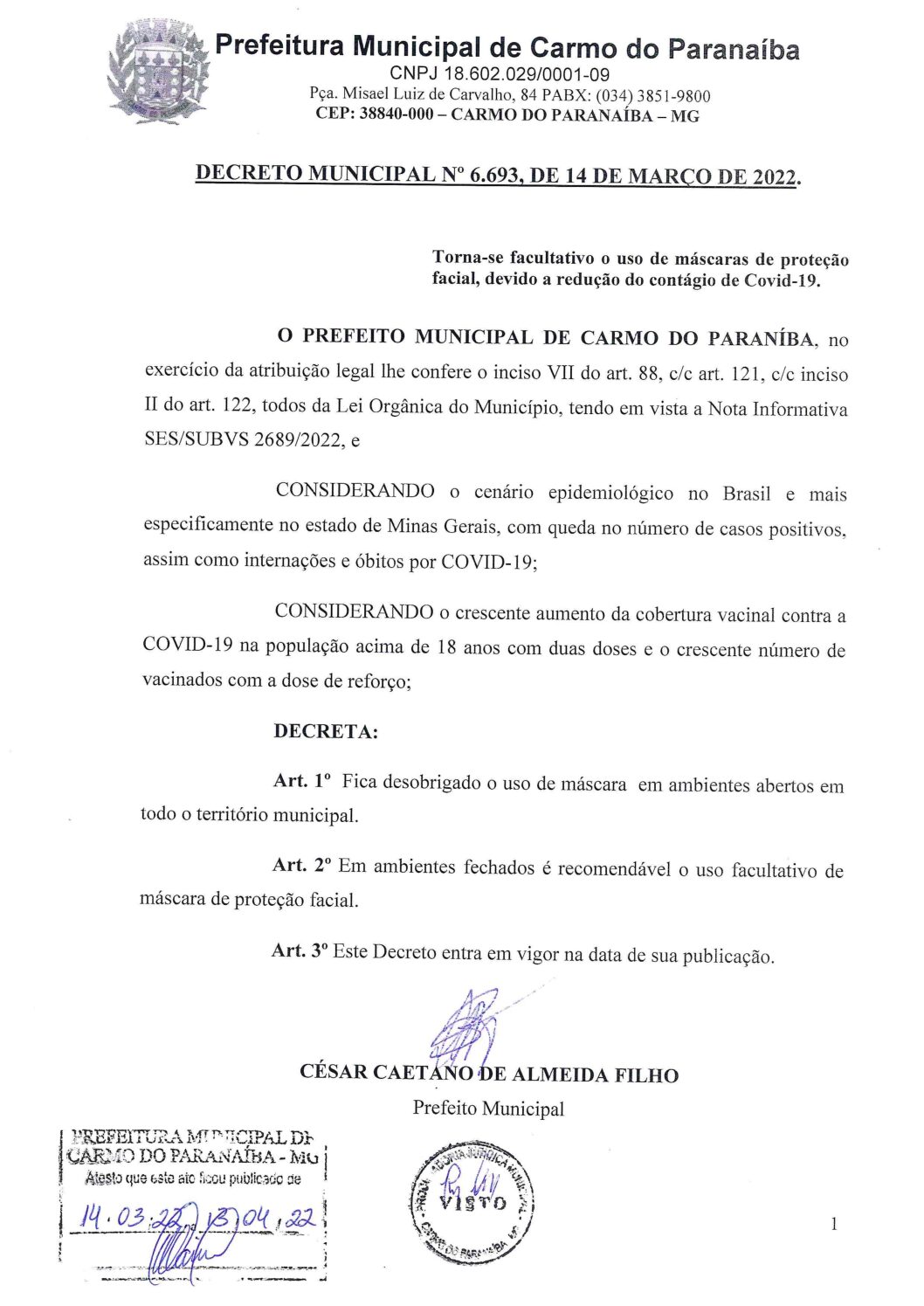 O prefeito de Carmo do Paranaíba, César Caetano, assinou hoje (14), um Decreto Municipal que exclui a obrigatoriedade do uso de máscara em locais abertos no município.