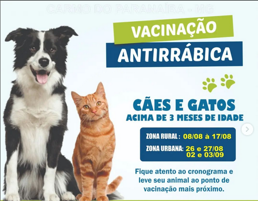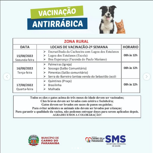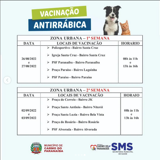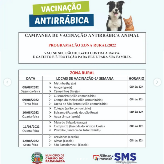 A Secretaria de Saúde e Vigilância em Saúde divulgaram hoje (27), o cronograma da VACINAÇÃO ANTIRRÁBICA 2022 no município de Carmo do Paranaíba.
