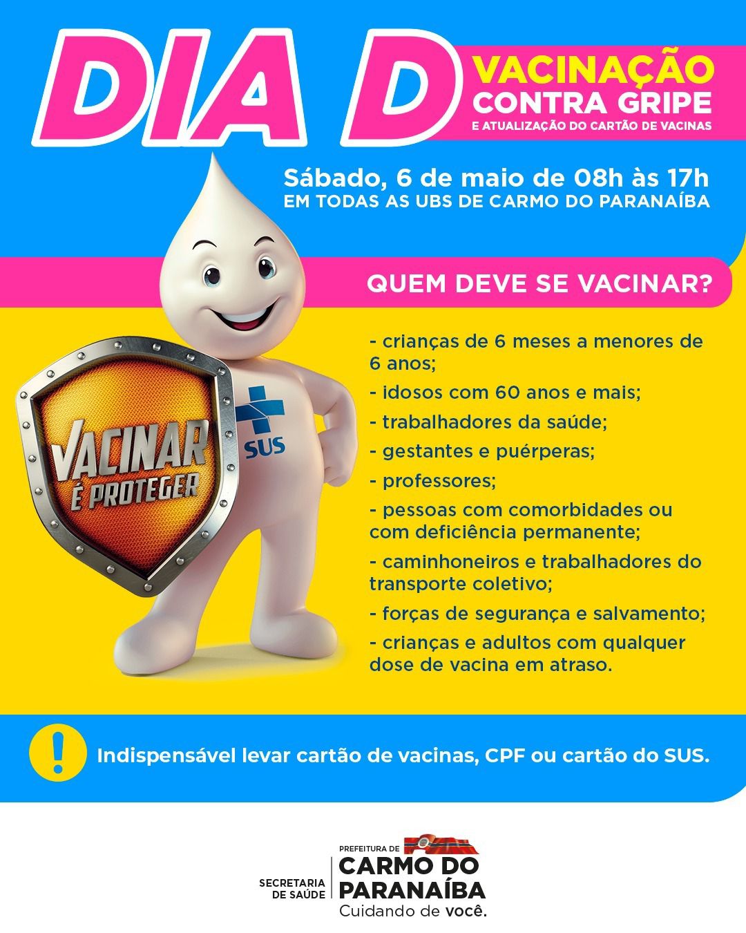 A Secretaria de Saúde de Carmo do Paranaíba realiza nesse sábado (6), das 8h às 17h, o Dia D da vacinação contra a gripe em todas as UBS’s do município.