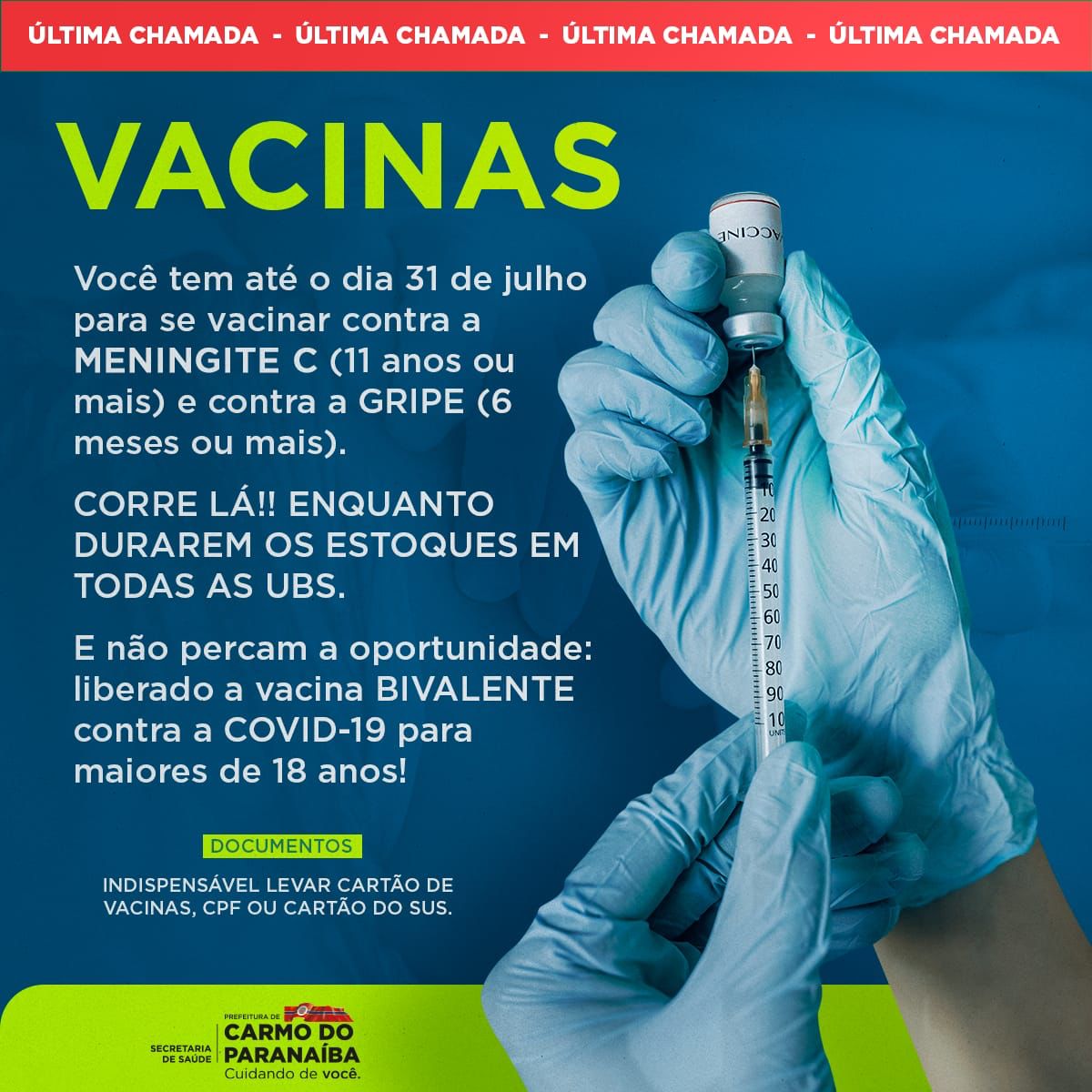 A Secretaria de Saúde de Carmo do Paranaíba informa que estão disponíveis em todas as UBS’ do município, a vacina Meningite C (11 anos ou mais) e contra Gripe (6 meses ou mais).