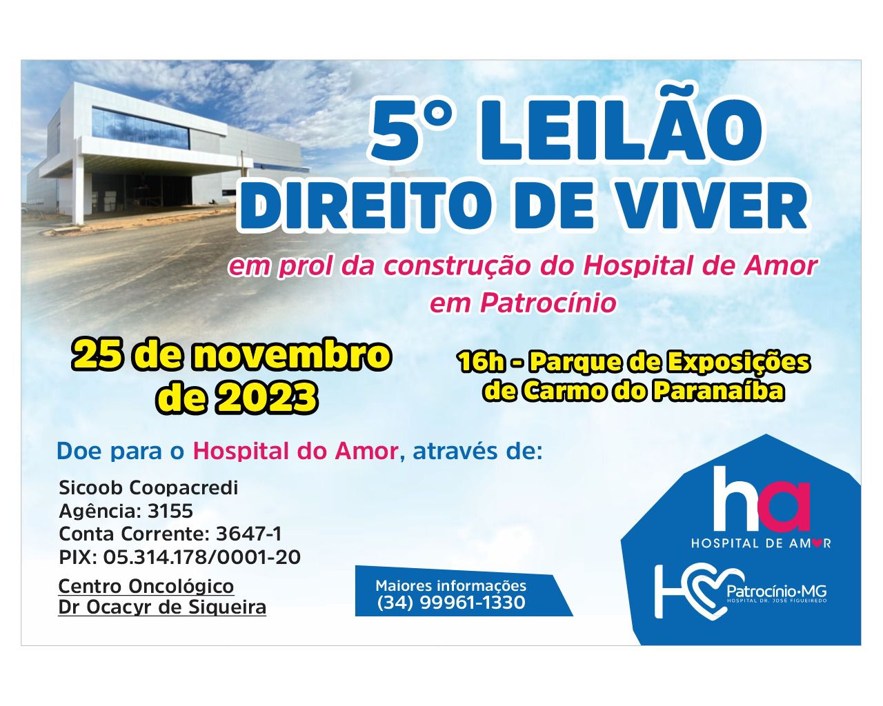 E pensando nisso, há cinco anos o município tem se empenhado na campanha em prol daqueles que tanto sofrem… o V Leilão Direito de Viver – para contribuir com a construção do Hospital de Amor de Minas Gerais em Patrocínio.