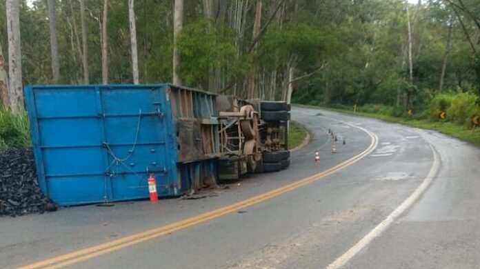 Uma carreta carregada com carvão tombou e interditou parcialmente o km 167 da MGC-354, entre Patos de Minas e Presidente Olegário, nesta sexta-feira (30/12)