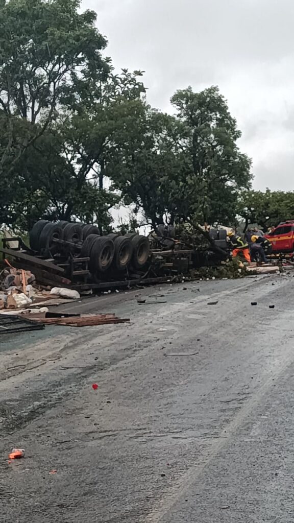 Na manhã desta sexta-feira (06/01), uma carreta carregada com tinner e outros derivados inflamáveis tombou no km 269 da BR-352, próximo à ponte sobre o Córrego São Bartolomeu, entre Lagoa Formosa e Carmo do Paranaíba.