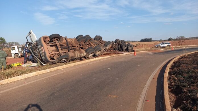Um acidente aconteceu no final da tarde de hoje (5), e deixou o motorista, de 56 anos, ferido. Ele perdeu o controle da carreta ao iniciar o trevo no km 65 da BR 352, no município de Coromandel.