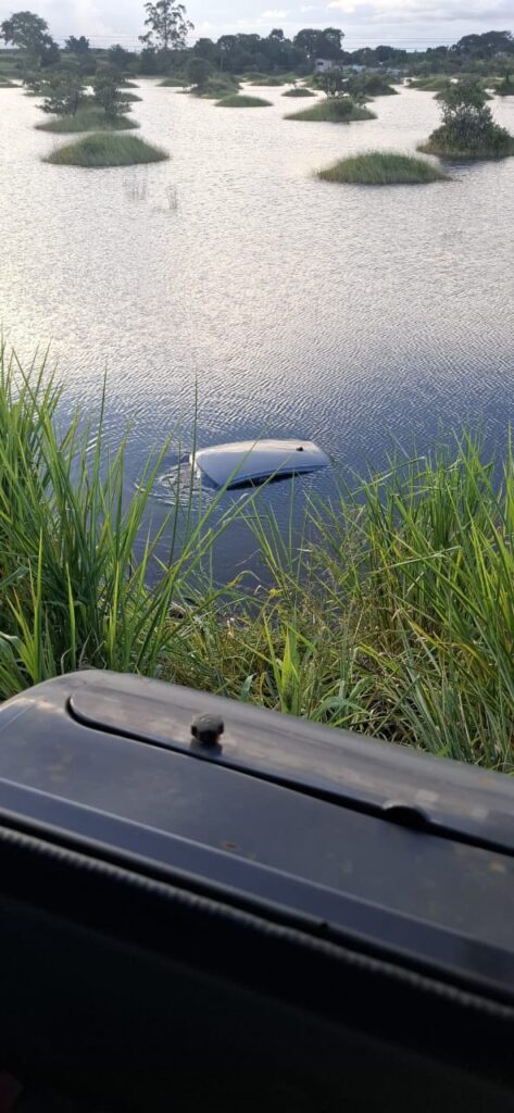 Um carro caiu em uma área alagada formada pelo acúmulo de água de chuva em meio à vegetação, nessa quinta-feira (26), às margens da MG-235, em São Gotardo/MG. Segundo a Polícia Militar Rodoviária (PMRv), o condutor perdeu o controle da direção e o veículo foi parar dentro da água.